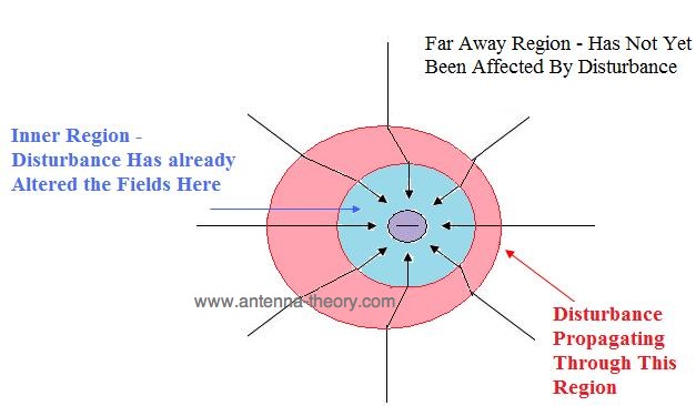 它還決定宇宙(再次無緣無故)干擾由于運動(或加速度)電荷將遠離充電 – C0 = 300,000,000 m / s的光速傳播。這意味著周圍電荷的電場受到干擾,并且干擾遠離充電傳播。如圖2所示。