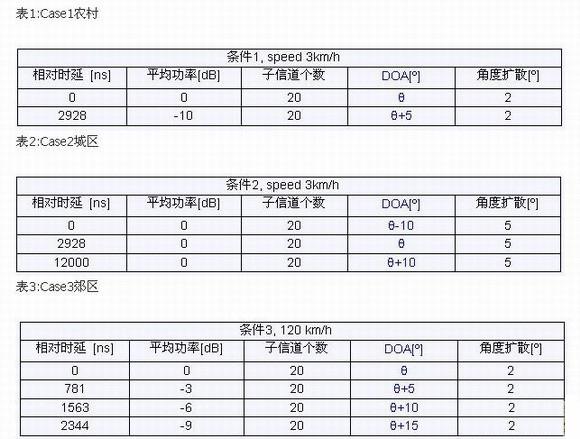 1)多天線解調(diào)測(cè)試(靜態(tài)測(cè)試):在不同的來波角度(DOA)下測(cè)試接收性能。各條徑存在一定的角度擴(kuò)展,各條徑分別來自不同的角度。驗(yàn)證在該傳播環(huán)境下接收機(jī)的解調(diào)性能。傳播環(huán)境如表1-表3所示。