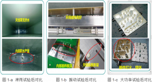 天線產(chǎn)品的可靠性的檢驗可以通過一系列試驗來判斷,可靠性試驗是對天線產(chǎn)品進(jìn)行可靠性調(diào)查、分析和評價的重要手段。天線的可靠性試驗包括高低溫試驗、淋雨試驗、振動試驗、沖擊試驗、碰撞試驗、汽車運輸試驗、風(fēng)載試驗、攝冰試驗和功率試驗等。通過環(huán)境試驗可以檢驗天線產(chǎn)品結(jié)構(gòu)的可靠性。如圖1所示,為淋雨試驗、振動試驗和大功率試驗后,滿足可靠性要求的天線與不滿足的對比測試結(jié)果。