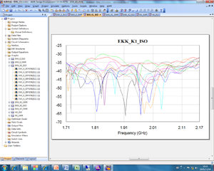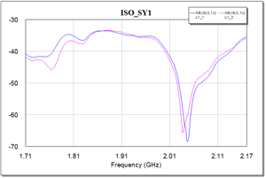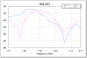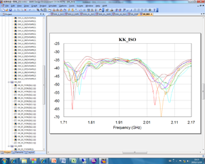 天線性能的一致性是指同一型號的天線產(chǎn)品的參數(shù)表現(xiàn)的吻合性,可以通過比較多個同類型產(chǎn)品的指標(biāo)曲線的近似度來判斷。如圖4所示,為同一類型的多個天線電壓駐波比曲線的一致性對比,左圖的多個天線駐波比曲線趨勢一致,偏差較小,表明該類型天線駐波比性能比較一致;右圖的多個天線的駐波比曲線沒有規(guī)律,比較雜亂,表明該類型天線的駐波比性能一致性較差。圖5為天線隔離度性能的一致性比較,同樣左圖天線比右圖天線隔離度參數(shù)的一致性要好。因此,可以認(rèn)為,左圖天線性能的一致性要好于右圖的天線。