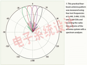 在3.4到3.6GHz頻段的開放環境對多束天線系統的輻射模式進行了測量。采用相位匹配RF電纜連接波束成型器與天線。波束成型器的輸入端口接3.440、3.480、3.520和 3.580GHz這四個不同的中心頻率、每個頻道的帶寬是7MHz。測試所用的RF功率是+5dBm,來自天線和波束成型器的聯合接收功率的測量是利用頻譜分析儀在距離200m處進行的。接收到信號的功率在以200m為半徑的圓周每隔1.0deg.測量一次,其中把四束天線作為圓周中心。圖7顯示了該實際輻射樣式。圖6也給出了采用MATLAB 軟件模擬得到的理論輻射樣式。